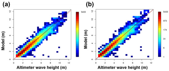 A lower scatter index is not always a reliable gauge for model performance [40]. The symmetrically normalized root square error (HH), also used for validation against altimeters, provides more accurate information on the accuracy of simulation.