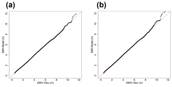 Quantile–quantile plots of observed Significant Wave Height (SWH), Hs, against modelled Hs for all of 2018. On the left is the IBI-CO run (a), on the right the IBI-DA run (b). The red line is the unit gradient line.