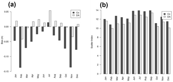 The bar plots for the monthly means in Figure 7 show, briefly, a consistent reduction in scatter index with data assimilated; it is most reduced in December, March and April, and least in January and September. The bar plots for bias reflect the shift from negative overall bias to positive overall bias, but in some instances, the absolute bias is greater with data assimilation—especially so in July, where the control run’s bias is already positive. The fact that the data assimilation always results in the bias tending positive suggests that a bias remains in the data. The monthly diagnostics reveals a moderate seasonal signature in scatter index, with higher scatter indices in the summer months, conserved in the IBI-DA run. The seasonal signature for the bias is almost inverted in the DA run, with higher absolute biases in summer than in winter (apart from November and February). With all this said, the highest absolute bias for all months in the IBI-DA run is only just over 5 cm, which, to put it into perspective, is about the same as the bias for the control run for the whole year.