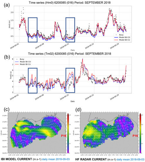 This is seen in the two coastal buoys located close to the strait of Gibraltar (buoys 6101404 and Tarifa-coast-buoy), where the difficulty of obtaining a good ocean current performance produces worse results: they are strongly influenced by an unrealistic ocean current overestimate, the Tm02, when Hs is low (less than 0.5 m). Figure 8 illustrates this pattern at buoy 6200085 (Cadiz deep buoy; see locations in the maps depicted in Figure 2) for a whole month, September 2018. This case is used because of the availability of surface current observations (the buoy location is covered by the Puertos del Estado HF Radar System) [49]. Skill metrics for mean period Tm02 weaken in the coupled model (correlation decreased from 0.83 for control simulation to 0.74 for IBI-CU in September). The time series depicted in Figure 8, help in analyzing this decrease in the validation scores. Figure 8b shows how differences in the wave period between the coupled and control run mainly occur on some specific days (events depicted in the figure by the dark blue squares). It is important to note that these days, when overestimated values for Tm02 in the IBI-CU solution are identified, show very low significant wave height values (Hs values being lower than 0.5 m; see Figure 8a). The IBI model surface currents can be validated with HF Radar observation for the day 3 September 2018. Comparison of daily averaged IBI model currents (Figure 8c) with the HF radar observed ones (Figure 8d) show how the unrealistic simulation of surface current at this location (P16 point indicates location of Buoy 6200085 used for the wave validation) spuriously introduces energy into the wave model, generating the increments of mean period in these cases, marked by low wave heights.