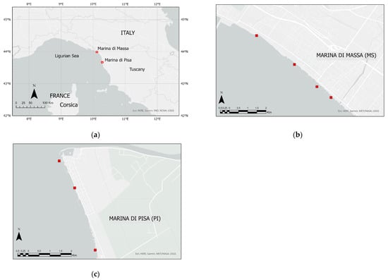 Study areas (a) Marina di Pisa, (b) and Marina di Massa, (c). Sources: Esri, DigitalGlobe, GeoEye, i-cubed, USDA FSA, USGS, AEX, Getmapping, Aerogrid, IGN, IGP, swisstopo, and the GIS User Community.