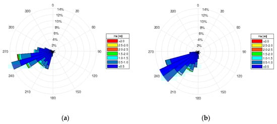 SWH maximum height and peak direction in Marina di Pisa (a) and Marina di Massa (b), period 2012−2019, months from June to September.