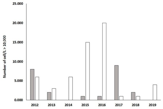 Number of blooms per year. In grey are the averages computed from 3 stations in Marina di Pisa; in white are the averages computed from 4 stations in Marina di Massa. The bars indicate the respective standard deviations.