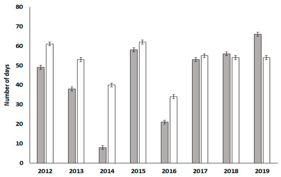 Number of days within the study period, for each year, when SST was above threshold. In grey are the averages computed from 3 stations in Marina di Pisa; in white are the averages computed from 4 stations in Marina di Massa. The bars indicate the respective standard deviations.