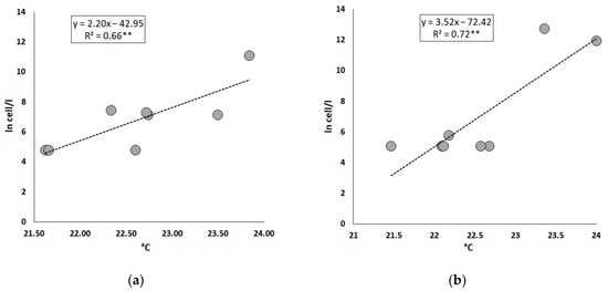 Scatter plot of monthly average temperature in June versus monthly averages of log accumulated cell/L in June, for every year, in Marina di Pisa (a) and Marina di Massa (b) (** = highly significant correlation, p < 0.01).
