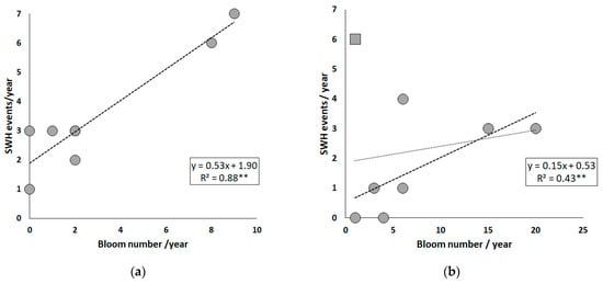 Scatter plots and respective linear regressions of accumulated bloom number versus wave remixing events, per year, in Marina di Pisa (a), and Marina di Massa (b); in (b), the statistics refer to the regression obtained excluding 2017 data (square dot) (** = highly significant correlation, p < 0.01); the thin regression line is obtained including 2017 (R2 = 0.03).