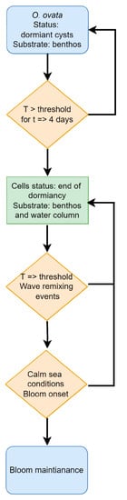 The relevance of these drivers has been investigated in several studies, which have also provided the basis for the development of specific models e.g. [26]. For example, a conceptual model of annual O. ovata bloom was developed by Accoroni et al. [27], who highlighted the synergistic effect between local hydrodynamic conditions, temperature, and nutrients availability as N and P (sampled in situ), suggesting that favourable conditions for bloom onset are when calm sea conditions occur in the days immediately preceding the bloom, after reaching a water temperature threshold necessary for excystment, and when N:P ratio is around Redfield. Some authors [28,29,30] have elaborated explanatory models performing multiple correlations of bloom dynamics with coastal ocean variables, highlighting the importance of temperature.