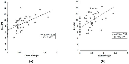 Scatter plots and respective linear regressions of SWH average before sampling day and log of accumulated cell/L in Marina di Pisa (a) and Marina di Massa (b) (** = highly significant correlation, p < 0.01).