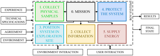 After the definition of the ES, the development of the functional decomposition is required to understand the connections between parts of the system which are unknown before executing the detailed design in order to fulfill the established requirements [57]. The resulting system’s architecture can be represented graphically, and describes the desired functions to be performed by the designed solution. Figure 1 presents a simplified functional decomposition for the ROV Pionero500, as reported in [54,58], a complex and complicated system in which multiple functions must be performed, often with internal and external interactions. As addressed in [54], this system’s architecture sets the foundations for the definition of a physical architecture, since it involves flows that connect abstract functions with a real context. Consequently, this is also the basis to define and develop a software architecture that allows the ROV system to perform all the functions it has been designed for, while being modular and flexible.
