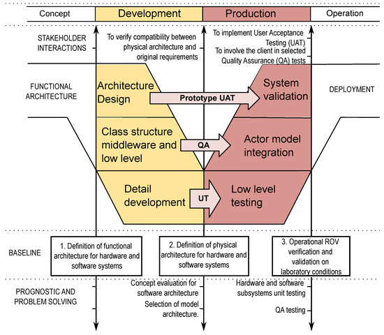 The V model is a basic model of traditional systems engineering. According to NASA [29] and INCOSE [57] systems engineering handbooks, technical processes can be organized and managed according to this model [59]. The V model shows the stages of the life cycle that are executed through levels, but carrying out verification and validations at the end of each stage in order to ensure that failures are not propagated in later stages, to finally verify that the user’s requirements have been fulfilled. In this way, then, the diagram begins in the upper left part with the definition of user requirements and ends in the upper right part with the confirmation of such requirements. The left side explains the requirement-based design process from top to bottom, while the right side explains the validation and integration process from bottom to top [60]. Part of the model used on the ROV Pionero500 is shown in Figure 3, focusing on development and production stages, while concept and operation stages are addressed deeply in [54]. The outcome of such stages is mostly common for both software and hardware systems.