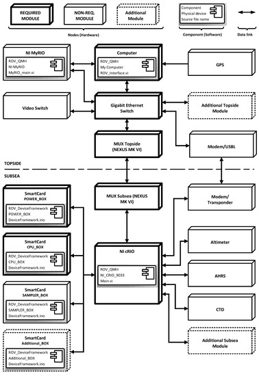 Physical modules are represented as UML nodes, and are differentiated in the architecture according to its dependability. Some modules are required for the architecture to work; others can be removed or added, including original equipment manufacturer (OEM) modules that are usually closed software platforms; custom devices are developed from scratch. An example of required modules are those associated with communication tasks and data processing, such as topside computer, Ethernet switch, multiplexer units, and the National Instruments (NI) CompactRIO (cRIO) vehicle’s computer. Modules with software that has been developed or modified by the team are distinguished from the rest by having UML components inside. Finally, this structure considers other components that can be added in the future, which gives advantages in terms of modularity and scalability.