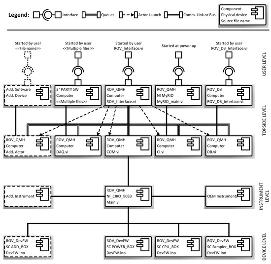 Regarding modularity, components identified with dashed lines are named as additional. This indicates where to include future modules and how they would interact with others in the architecture. For example, an additional actor included in the topside level needs to be launched by ROV\_Interface.vi, and communicates through queues with other actors.