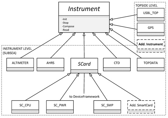 It is worth mentioning that this model has made it easier to extend the system’s functionality, as actors are defined with clear communication schemes: internally, using LabVIEW queues’ asynchronous messaging capability; and externally, exchanging data with additional applications, thanks to the extensive and diverse communication tools provided by the integrated development environment (IDE) and third-party applications developers. On the other hand, not every feature of the actor model is required in lower levels of the architecture, e.g., user interfaces are only present at the topside level components. A simplified model was necessary at the instrument level, without losing modularity and concurrent development capabilities. As described in Section 2.6, the OOP paradigm favors high cohesion, low coupling, modularity, and reusability of code; therefore, it was considered for instrument level software design. The resulting architectural design highlights can be expressed through class diagrams in the following section.
