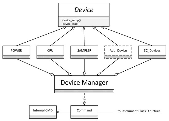 Firmware development followed the same principles of modularity and concurrent development as the higher levels. Previous successful experiences from the hardware development team in modular, OOP-based architectures running on microcontrollers [61] supported this approach, and established the starting point for the device level class structure design. Figure 7 presents a simplified class diagram that implements an adapted version of the modular class models developed for upper levels of the architecture. Here, an abstract class Device serves a similar purpose to Instrument class of Figure 6, as functionality is implemented by deriving devices. In this case, calling of devices is in charge of the class Device Manager, which instantiates every device and handles execution of its inherited methods. Such methods are device_setup, similar to Instruments Init, this is meant to be executed once at startup and contains routines to initialize devices, and device_loop, which contains device routines that have to execute periodically.