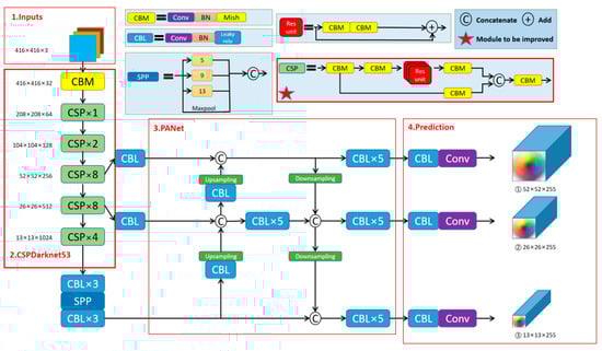 The YOLOv4 detector is able to predict the location of the bounding box and the probability of its class directly from the entire image through just one neural network, which turns object detection into a regression problem. Therefore, it is very suitable for real-time detection of applications. YOLOv4 mainly includes CSPDarkNet53 feature extraction backbone network, SPPNet (Spatial Pyramid Pooling Network), PANet (Path Aggregation Network) multi-scale prediction network, and network prediction head (YOLO Head). Among them, CSPDarknet53 consists of 5 large residual blocks. The number of small residual units contained in these 5 large residual blocks is 1, 2, 8, 8, and 4, respectively, that is, two CBM convolution modules and one CSPX. The convolutional modules together form a large residual block. After the last feature layer output of CSPDarknet53, SPPNet is added, and four different scales of maximum pooling are used for processing. The pooling kernel sizes of maximum pooling are 13 × 13, 9 × 9, 5 × 5, 1 × 1 (1 × 1 means no processing); this pooling operation can improve the inference ability of the model with little increase in the inference time of the model. PANet consists of two parts, upsampling and downsampling, making full use of feature fusion. YOLOv4 has 3 prediction heads, and the output shapes of the 3 prediction heads are (13, 13, 255), (26, 26, 255), (52, 52, 255), which are used to extract multi-scale features for object detection. The complete network structure is shown in Figure 1. This network structure can train a deep learning model to predict the bounding box of the object and the probability of its class from the original image.