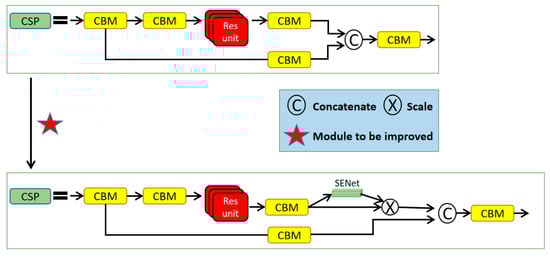 Finally, the channel attention mechanism is embedded in the backbone feature extraction network to extract the weighted multi-scale effective features, thereby improving the detection accuracy of the model. The improvement of the backbone feature extraction network part is shown in Figure 3.