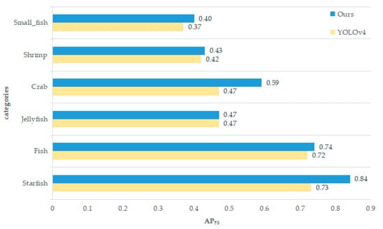 In order to further verify the validity of the model in the Brackish dataset, this paper also evaluated improvements in the detection accuracy of various organisms in the dataset after the model was improved, as shown in Figure 4. It can be seen that the improvement in the detection accuracy for the starfish class was significantly higher than that of other classes, proving that the proposed model is better for the detection of objects with unique shapes, and that which are almost stationary.