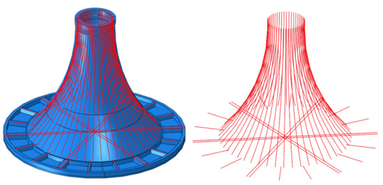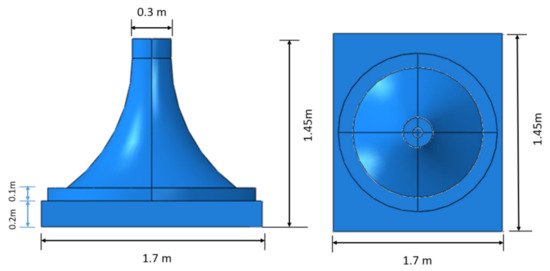 The marine environment and load conditions are complex. The horizontal, vertical, and bending moment loads [20,21] caused by wind, waves, and currents are coupled together to act on the foundation of the wind turbine, and the load is transferred to foundation through the transition section. From the top to the bottom of the transition section, the increased bending moment load requires a larger section, and the wind, wave, and current load increases sharply with the increase of the section of the transition section. Ding [22] proposed a prestressed concrete hyperbolic arc transition section structure after comprehensively considering the force characteristics and wind, wave, and current load at the top of the transition section. Aiming at the bearing and force characteristics of CBF, Liu [23] used Abaqus to give the yield envelope shape and failure mode of the bucket foundation in the V-H, V-M, H-M, and V-H-M spaces. Furthermore, Liu [24] gave the envelope surface of the CBF with transition section under the control condition of foundation deformation. The envelope surface only reflects the overall load-bearing characteristics of CBF but fails to reflect the force transmission characteristics of CBF. Zhang [25,26] used topological optimization and mathematical programming methods to optimize two transition sections and obtained the straight-line and arc-shaped thin-walled transition section structures. Studies found that the force transmission path of the thin-walled transition section structure is more reasonable; the arced structure has a better load-bearing performance; the stress can spread along the height and the circumferential direction, and the distribution is more uniform. Ding [27] used prestressed concrete beams and other structural stress systems for reference and designed the most economical and optimal structural system with the goal of simultaneous tensile and compression failure under the ultimate load of the arc-shaped transition section structure and used numerical simulation to study the force transmission characteristics of the arced transition section.
