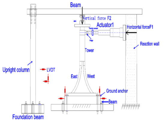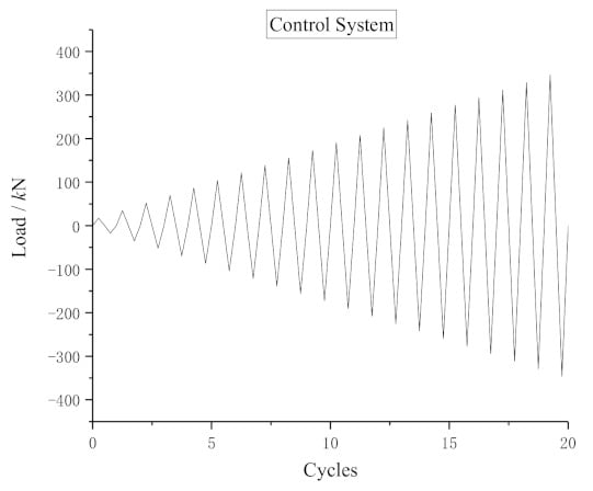 The transition section model is fixed on a concrete base by two steel beam ground anchors, and a horizontal reciprocating load is provided by a loading system consisting of a 150-ton horizontal bidirectional tension and compression jack. The horizontal loading point is located at the top of the transition section, and two semi-circular hoops are connected by four steel screws to connect with the horizontal jack. A vertical jack is arranged on the top of the model and connected with a pressure sensor, as shown in Figure 5. The vertical load on the top surface of the foundation is 18 kN. The test loading system adopts load control, and the load level difference is 17.3 kN. The loading system is shown in Figure 6. At the beginning of the loading, the vertical load is applied to the required value of the test and kept stable, and the horizontal force is applied step by step until the specimen is broken. Observe the damage morphology of the specimen during the loading process and stop loading when there is obvious damage. The experiment measures horizontal load, displacement, and steel and concrete strain, and the layout of steel and concrete measuring points is shown in Figure 7.