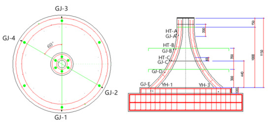 Through experiments, it was found that the number of prestressed steel bars was not as good as possible, and the design needed to be combined with the wall thickness: (1) Consistent with the design principles of prestressed beams, the structure cannot have tensile stress. (2) To give full play to the compressive performance of concrete, under the action of large bending moment load, the tension and compression on both sides of the transition section should reach the control limit at the same time. Through this experiment, the rationality of this design method is verified, and the improved energy consumption performance of this structural system is verified. Due to the consideration of the external tension effect of the prestressed system, the hoop stirrups can no longer be designed as structural steel bars and need to be designed as main stress steel bars. The above research results have directly guided and applied to the foundation design of many offshore wind farms such as Dafeng Xiangshui, as shown in Figure 24 [31]. In the design of the CBF, according to the simultaneous failure of the tension zone and the compression zone as the optimization objective, the structure of the arc-shaped transition section is optimized and analyzed, and the optimal prestress value is determined. Combined with the design and construction requirements, the optimal prestressed system of the arc transition section is obtained. The arc transition section is set with 48 bundles of high-strength and low-relaxation prestressed steel strands, with a tension control stress of 1270 MPa, arranged in a single row, and the anchor head of the fixed end of the prestressed tendon goes deep into the inner ring beam and is closely connected with the foundation top cover, as shown in Figure 25.