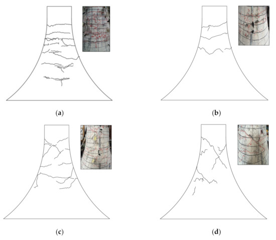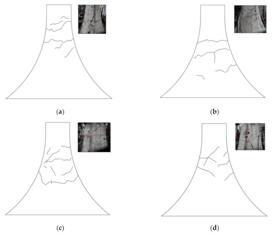 The failure morphology and structural crack distribution of GD2 specimens are shown in Figure 9a–d. Loaded to level 5, transverse fine cracks appeared near the top 45cm of the transition section from the positive tension side (Figure 9a), and the structural cracking load was 85.47 kN. The top displacement of the component reached 4.1 mm, and no concrete cracks were seen on the north and south sides of the structure. As the loading progressed, the cracks extended to both sides. To the 8th level, cracks appeared at a position 30 cm from the top, and diagonal cracks appeared on both the north and south sides of the transition section. The initial crack width further increased as the load increased; no new cracks appeared in the height range of the positive and negative tension sides, and the cracks entered a period of stable development. Then, the cracks on the tension side expanded and went through gradually, and finally the circumferential cracks went through at the midpoint of 0.65 m from the top of the transition section, and the width reached 0.43 mm. The concrete protective layer in the compression zone peeled off, and the steel bars were exposed. Obvious oblique cracks appeared on the back of the specimen and gradually extended downward, and the load was stopped. The top displacement of the transition section reached 17.2 mm, and the load value was 247.36 kN.