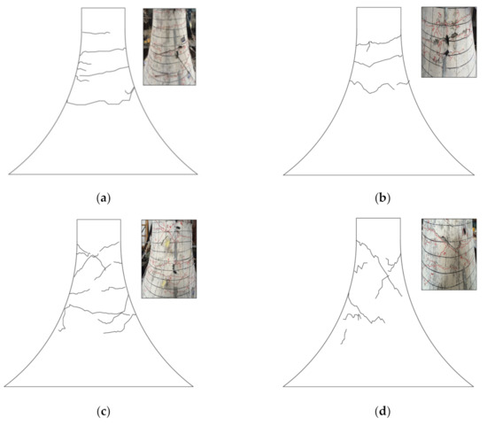 The failure morphology and structural crack distribution of the GD1 specimen during the loading stage are shown in Figure 8a–d. Loaded to level 4, transverse fine cracks appeared near the positive tension side measuring points A and B. At this time, the structural cracking load was 62.98 kN; the top displacement of the member was 3.3 mm, and no concrete cracks were seen on the left and right sides of the structure. As the loading continues, the cracks gradually develop downward along the height of the transition section. Loaded to level 5–6, two circular cracks appear 40 cm from the top of the transition section and extend to both sides. As the load continued to increase, multiple parallel cracks appeared in the height range of the tension side edge, and many oblique cracks appeared on the left and right sides. The crack direction was approximately 45° with the loading direction (Figure 8c,d). As the loading continues, the cracks on the tension side continue to expand and penetrate gradually and finally the circular crack through the middle of the specimen 0.55 m from the top of the transition section. When the crack width reaches 0.4 mm, the concrete protective laminate in the compression zone collapses and peels off, and the steel bars are exposed. In order to ensure the safety of the test, it was decided to stop loading. The top displacement of the transition section reaches 19.7 mm, and the load is 228.97 kN.