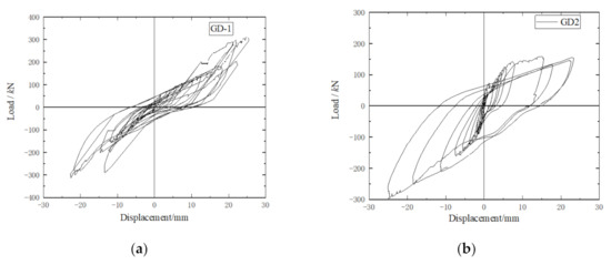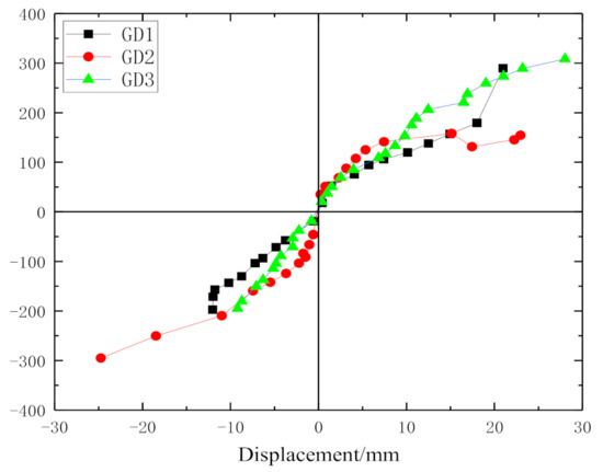 The load-displacement hysteretic curves of GD1~GD3 specimens are shown in Figure 11. The hysteresis curve of the GD1 specimen is a typical inverted S shape, the area enclosed by the loading ring is small, and the energy dissipation capacity and seismic performance of the specimen are poor. During the loading process, diagonal cracks appeared in the transition section area, shear deformation occurred, and the slope of the hysteretic curve became slower. After the 10th load specimen slipped, the load rose again. The GD2 specimen showed a fusiform shape in the early stage of loading, with a full hysteresis curve, a larger enclosing area, and good energy consumption. During the loading process, it gradually transformed into a bow shape. The reason was that the steel bars in the specimen slipped as the cracks developed. The obvious asymmetry of the hysteresis curve of the specimen is caused by the cracking of the concrete during the forward loading process and the gradual inconsistency of the sections on both sides of the specimen that participate in resisting the external load. The GD3 specimen is in a typical inverted S shape during the loading process. The hysteresis loop in the load-displacement curve has good symmetry; the area enclosed by the loading loop is large, and the energy dissipation capacity of the specimen is acceptable.