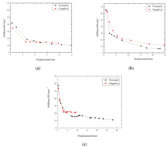 The stiffness of the structure reflects its ability to resist deformation. The stiffness degradation of the specimen is a sufficient manifestation of the development of the plastic deformation of the material. It essentially reflects the influence of the cumulative damage of the specimen under repeated loads and is an important feature of the hysteretic performance of the structure [30].