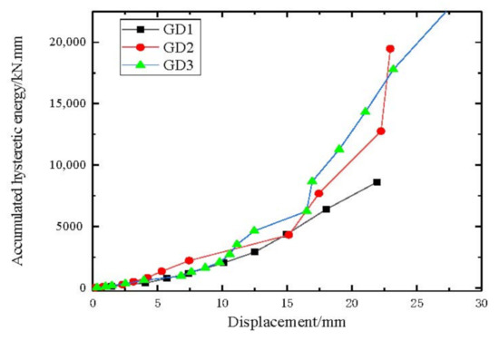It can be seen from Figure 14 that the cumulative energy consumption of the three specimens is relatively small at the beginning of loading. As the loading displacement increases, the cumulative energy consumption value of each specimen increases. The cumulative energy consumption value of the prestressed GD2 and GD3 specimens is significantly greater than that of the GD1 specimen, and the prestressing is helpful to increase the seismic performance of the arced transition section. When the displacement reaches 23 mm, the energy consumption capacity of GD2 specimen exceeds that of GD3 specimen, and the energy consumption capacity of GD2 specimen is the best. The cumulative energy dissipation curve of the GD3 specimen has a slight abrupt change in the growth rate at a displacement of about 17 mm. The main reason is that the area enclosed by the hysteresis curve of the specimen is small before yielding, and as the displacement of the top of the transition section increases, the area enclosed by the hysteresis loop of the specimen also increases gradually. After reaching the peak load, the area enclosed by the hysteresis loop gradually decreases as cracks appear in the middle of the transition structure and gradually extend to the back.