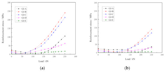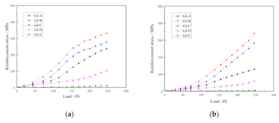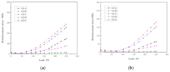 The stress curve of the steel bar of the GD1 specimen is shown in Figure 15. Since the positions of the loading and measuring points are symmetrical, the stress changes of the steel bars at the symmetrical positions are similar. Take the stress data of each measuring point of No. 1 and No. 2 steel bars under unidirectional loading for analysis. The distribution positions of reinforcement measuring points A~E are shown in Figure 7. The stress of each measuring point within the range of the height of the longitudinal bars at the initial stage of loading increases slowly. After the concrete on the tensioned side cracked, the concrete was withdrawn from work, and the load was carried by the steel bars. The curve increased significantly, and the stress values of the steel bars at the measuring points B and C were both larger. It can be clearly seen from Figure 15b that the transition section structure transmits a relatively large force in the range of 60 along the ring direction. The distribution law in the section height range is similar to that of No. 1 steel bar, and the stress value of the steel bar at the measurement point E at the bottom of the transition section is very small. Figure 16 and Figure 17 are the curves of the stress of the steel bars of the GD2 and GD3 specimens as a function of the load, respectively. After the prestress is applied, the stress of each cross-section steel bar changes linearly with the increase of the load; the stress of each measuring point is obviously reduced, and the stress value of the measuring point B and C is the largest. When the load is less than 150 kN, the stress of the steel bar at the measurement point D of the GD2 specimen is greater than the A measurement point. Before the load reaches 200 kN, the stress at the measurement point D of the GD3 specimen is greater than that of the measurement point A, and the stress at the bottom of the measurement point E also increases significantly. It can be seen from Figure 16b and Figure 17b that the stress of the GD3 specimen is smaller than that of the GD2 specimen. Due to the special structure of the arc-shaped transition section, the stress in the lower half of the middle structure increases more than the upper half, and the force transmission path of the transition section is distributed roughly in a fan shape.