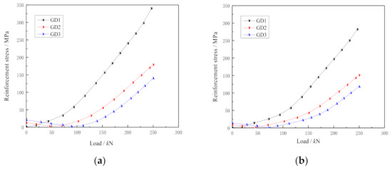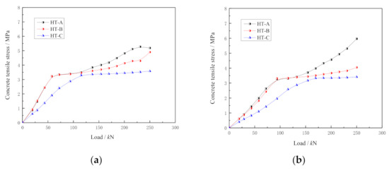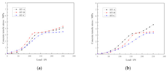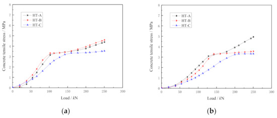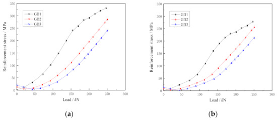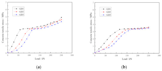 The stress changes of No. 1 and No. 2 concrete measuring points are similar after loading, and No. 1 concrete is used for analysis. It can be seen from Figure 23 that the concrete tensile stress of the GD1 specimen increases faster when loaded to the first level of load, and the tensile stress of the GD2 and GD3 specimens increases rapidly when the third load is applied. After the fifth load, the concrete tensile stress of the GD1 specimen enters the horizontal section. Before cracking, the concrete tensile stress and the load maintain a linear relationship. After the cracking, the stress quickly concentrates on the crack position, the force position shifts, and the curve turns. After loading to the 9th and 10th loads, the concrete tensile stress law of the GD1, GD2, and GD3 specimens is consistent.