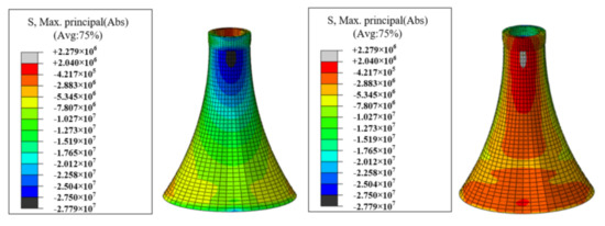 The concrete material in the finite element model is C60, the plastic damage constitutive model is adopted; the Poisson’s ratio is 0.17, and the density is 2500 kg/m3. The radial and hoop bars are HRB335 bars, and Tie contact is set between the parts in the model. The concrete is simulated by C3D8R solid elements, the prestressed steel strand and the reinforcement bars are simulated by T3D2 truss elements. More details on the setup of the finite element model of CBF are in Zhao’s paper [31].