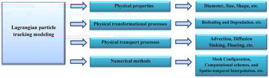 The structure of Lagrangian particle-tracking models in the simulation of microplastics’ physical properties, physical transformation processes, physical transport processes, and numerical methods.