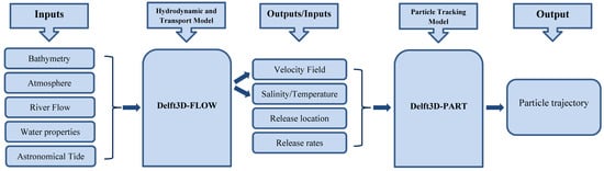 Delft3D, as open-source software, can be applied for simulating flows, the transport of sediments, tidal currents, water quality, waves, etc. in various water settings. Delft3D has several modules as shown in Figure 2. The modules are linked to each other in order to simulate the multi-dimensional transport and hydrodynamics (in 2D or 3D) [117]. Particle transport and dynamical spatial distribution are simulated by the PART module of Delft3D using particle-tracking modeling using the inputs provided by the FLOW module (i.e., two- or three-dimensional flow data). In other words, velocity and other hydrodynamic parameters are computed by the FLOW module using an offline coupling and provided as inputs for the D-WAQ PART module.