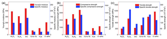Comparison of materials’ mechanical and load-bearing properties. (a) Young’s modulus vs. specific modulus; (b) Compressive strength vs. specific compressive strength; (c) Tensile strength vs. specific tensile strength.