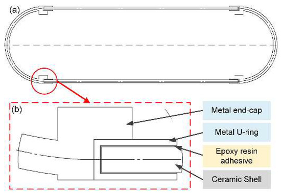 The typical ceramic pressure housing consists of a ceramic cylindrical shell, two hemispherical metal end-caps, two metal U-rings, and epoxy resin adhesive, as shown in Figure 2. The metal U-rings are bonded to both ends of the ceramic shell to protect the end surfaces and act as sealing surfaces. Although the end faces of the ceramic shell can fully meet the sealing requirements by grinding, it has a high probability of being damaged in practical applications. The structure of the metal U-ring has been well documented in the literature [7]. The hemispherical metal end-cap is the most common blocking structure in pressure housings. The holes in the end-caps are required for the interaction of signal and power between the inside and outside of the pressure housing. End-caps are easily manufactured from metal materials, but it is impractical to use ceramic materials due to the high price, long processing period, and poor reliability. Therefore, it is inevitable that the ceramic and metal press against each other under hydrostatic pressure. Then, the Poisson effect occurs, which generates tensile stress on the ceramic contact surfaces.
