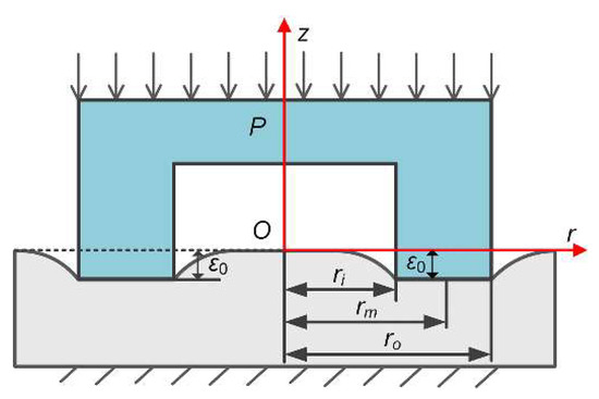A simplified geometric model of the contact pair is shown in Figure 3. The origin of the cylindrical coordinate system O (r, φ, z) is fixed at the annular center of the unloaded contact plane. The z-axis is the symmetry axis, and the r-axis points outward along the contact surface. After applying the hydrostatic pressure P along the z-axis, a smooth, infinitely rigid flat annular indenter is pressed into the elastic half-space with ε0. The outer diameter of the ceramic shell is ro, the inner diameter is ri, and rm is the middle diameter.