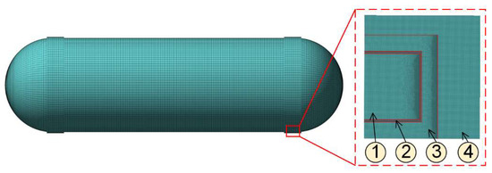 The finite element method simulation is used for the verification of the approximate model. In this paper, the simulation tool used is the commercial software ANSYS Workbench. The ceramic pressure housing is a typical axisymmetric rotating body. By reducing the dimensions and using an axisymmetric analysis of the ceramic pressure housing, we can effectively reduce the calculation costs and obtain a higher level of accuracy. In addition, in Ansys Workbench, the mesh and analysis results in three-dimensional states can be obtained by “Symmetry”. The mesh of the contact area is further refined to obtain higher local calculation accuracy. Figure 4 shows a ceramic pressure housing mesh with “Symmetry”. The grid numbers of the nine groups of ceramic pressure housings range from 249,147 to 277,924, with an average of 262,928, and the number of nodes ranges from 766,514 to 853,087, with an average of 807,927. The contact regions at one end of the ceramic pressure housing include the “metal U-ring and metal end-cap”, “metal U-ring and epoxy resin adhesive” and “epoxy resin adhesive and ceramic shell end face”. Since the metal U-ring and the metal end-cap are fastened by multiple bolts in practice, the contact type of the contact region in ANSYS Workbench can be regarded as “bond”. In addition, the other two contact regions are adhesive surfaces, which are also set to the “bond” contact type. Hydrostatic pressure of 115 MPa is applied uniformly outside the ceramic pressure housings.