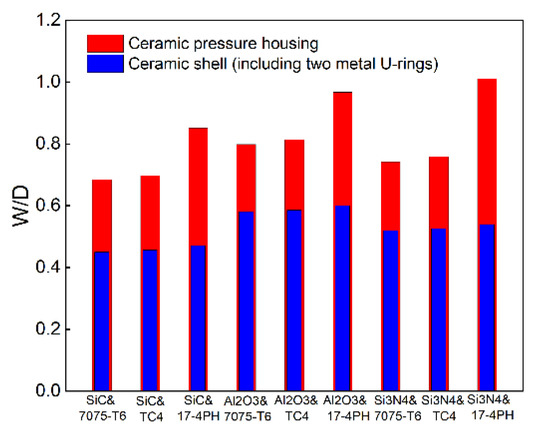 The wall thickness of the metal U-ring is set to 3 mm, and the slot depth is set to 36 mm (approximately 2.5 times the wall thickness of the ceramic shell). The W/D of the nine groups of ceramic pressure housings and ceramic shells (including two bonded metal U-rings) are calculated and shown in Figure 5. Based on the preliminary design, the SiC ceramic pressure housings and shells have better W/D than the Al2O3 and Si3N4 ceramic pressure housings and shells. This is because the specific modulus and specific compressive strength of the SiC ceramic are the best among the three ceramic materials (see Table 1). The optimal combination is SiC&7075-T6, with W/D values of 0.685 and 0.45 for the housing and ceramic shell, respectively. Although the use of metal components enhances reliability, it weakens the W/D performance of the ceramic pressure housing.