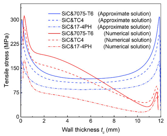 The linearized distribution of the tensile stress on the ceramic contact surface along the wall thickness direction is shown in Figure 8, Figure 9 and Figure 10, where rc = 0 represents the boundary of r = ri. Figure 8, Figure 9 and Figure 10 show the results of three groups of SiC ceramic pressure housings, three groups of Al2O3 ceramic pressure housings, and three groups of Si3N4 ceramic pressure housings, respectively. The results of the approximate model (κ = 2.97) and FEM simulations indicate that the smaller the difference in Young’s modulus of the materials, the lower the tensile stress on the ceramic contact surface. In addition, there are concentrations of tensile stress near the two boundaries of the ceramic contact surface. It can also be concluded that the most likely region of failure is near the inner boundary of the ceramic shell.