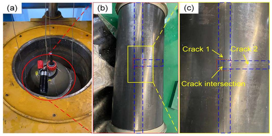Hydrostatic pressure experiment for the SiC&7075-T6 ceramic pressure housing. (a) The SiC&7075-T6 ceramic pressure housing loaded into the high-pressure chamber; (b) Failed pressure housing; (c) Partial view of the failed pressure housing with two cracks.