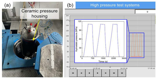 Hydrostatic pressure experiment of the SiC&TC4 ceramic pressure housing. (a) SiC&TC4 ceramic pressure housing loaded into the high-pressure chamber; (b) Hydrostatic pressure curve (three cycles from 0 to 110 MPa).