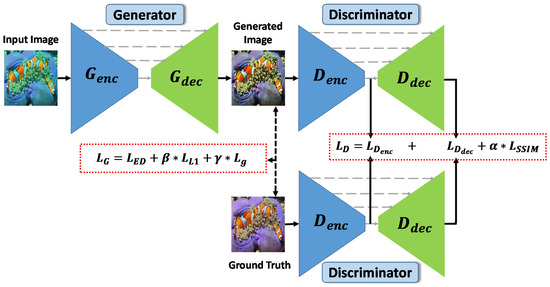 With the increasing resources of data and computing power from time to time, traditional methods are being substituted by artificial intelligence (AI). Deep learning has gained popularity due to its exceptional performance when trained with massive amounts of data. Furthermore, various convolutional neural network (CNN) architectures have been applied broadly to computer vision tasks, e.g., image deraining [1], image super-resolution [2], and image denoising [3], and deep learning has been applied to enhance underwater images [4,5,6,7,8,9]. Generative adversarial networks (GANs) have improved tremendously in the field of synthetic images, by which underwater image quality can be enhanced using a large collection of paired or unpaired data. The basic architecture of GANs are based on the structure of two neural networks, making one against another to create instances of data that are synthetic enough to pass the discriminator as real data. These networks are widely used in the field of generating images, videos, and voices.