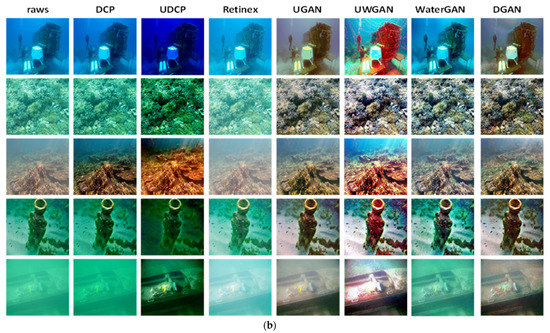 First, we evaluated the proposed method on the test sets of the two datasets with traditional and deep-learning methods. The quantitative evaluation is summarized in Table 1. The best results of different metrics are marked in bold. Table 1 shows that no method is best in terms of all metrics. However, the results demonstrate that DGAN outperforms other methods in terms of both PSNR and SSIM. To demonstrate the advantages of the proposed DGAN, visual comparisons are presented in Figure 5a,b. Although the two images may give the impression that the UDCP results are sharper, a careful inspection reveals that UDCP leads to excessive enhancement and oversaturation. Similarly, the UWGAN images are unnatural and excessively enhanced. As opposed to UWGAN, the proposed method presents promising results without introducing artificial colors and casting colors on real-world imagery. The main reason is that the generator network of the proposed model uses dilated convolution layers to control the receptive fields of a filter without changing the dimension of the data via polling or striding, and without increasing the number of parameters. This property is especially useful in tasks where the precise pixel position is important. Finally, the restored images by DGAN obtained better image enhancement results on the two datasets, with improvements in both visual quality and quantitative metrics compared to existing methods. Overall, deep-learning-based methods produce better restoration results than traditional methods, which produce blurry and colorcast results. This is exhibited for DCP [10], UDCP [11], and the retinex-based method [17], as the ineffective result shows the unsuccessful removal of the green-bluish tone in the underwater images. Deep-learning-based methods have fewer color artifacts and more high-fidelity object areas.
