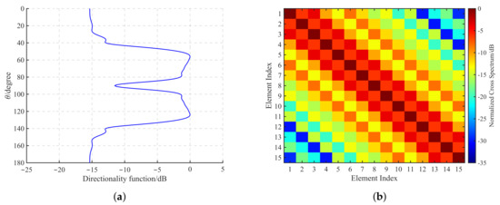For the spatially correlated noise field, we consider the wind-generated noise and use the K/I model to calculate the vertical directionality and the correlation of it [25,26]. The vertical directionality and the normalized CSM of the wind-generated noise at 750 Hz in shallow water are shown in Figure 2.