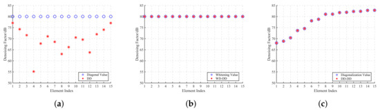 The denoising factors for Figure 5a–c is displayed in Figure 6a–c, respectively. The denoising matrices calculated by DD, WD-DD, and DD-DD in the physical domain are illustrated in Figure 6d–f, respectively. It can be seen from the results that all three denoising methods can reduce the noise to different degrees. However, DD only reduces the diagonal elements, and the denoising factors are much smaller than the diagonal elements of the received noise CSM as illustrated in Figure 6a, resulting in the poor denoising effect for spatially correlated noise. According to Figure 6e,f, WD-DD and DD-DD reduce not only the diagonal elements but also the off-diagonal elements. In addition, more denoising factors of DD-DD are close to the diagonal elements of the diagonalized noise CSM and thus the denoising matrix of DD-DD is closer to the received noise CSM, seen in Figure 5a and Figure 6f. All results illustrate that the performance of DD-DD is better than the other two denoising methods for spatially correlated noise.