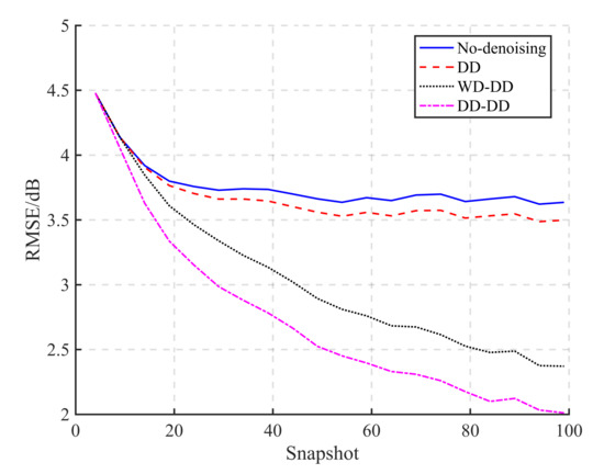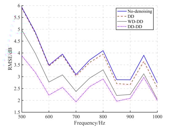 The variation of RMSE with the SNR of the received data is shown in Figure 7. The power of the radiated noise increases from 100 dB to 140 dB, and the corresponding SNR range of the received data is about dB because of the 40 dB transmission loss. It can be seen that all RMSEs decline with the increasing SNR. The denoising effects on radiated noise measurement with WD-DD and DD-DD are apparent when the SNR of the received signal is under 5 dB, while the denoising effect of DD for spatially correlated noise is not evident. The RMSE of the radiated noise measurement with DD-DD is about 1.6 dB smaller than the RMSE without denoising when the SNR of the received data is under dB. When the SNR is over 10 dB, the RMSE of noise measurement is tiny and the performance will hardly be improved by the denoising technique.