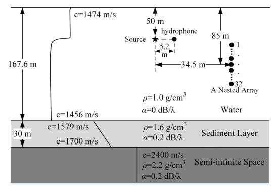 In this section, the performance of DD-DD on underwater radiated noise measurement is validated with experimental data. The experiment was implemented in a reservoir in December 2019. The environment of the reservoir and the arrangement of the source and the array are shown in Figure 10. The sound speed profile in the water is measured by a CTD (standing for “Conductivity, Temperature, and Depth”). The speeds, densities and attenuations of the sound waves in the sediment layer and semi-infinite space are obtained according to the bottom material. A transducer (UW-350) located at the depth of 50 m was used as a source to transmit two types of signal, a Continuous Wave (CW) signal with the frequency of 750 Hz and a Linear Frequency Modulation (LFM) signal with the frequency band of 100–900 Hz and the duration 10 s. A nested array (consisting of a 24-element uniform linear array with 1 m inter-element spacing and a 17-element uniform linear array with 0.5 m inter-element spacing) was vertically deployed at 73–97 m deep, and 34.5 m away from the source. In addition, a single hydrophone located at the same depth as the source and a horizontal distance of 5.2 m away from it was used to monitor the radiated signals. The SNR of the hydrophone received data is high because of the small transmission distance, thus the influence of noise can be neglected and the PSD estimated by the hydrophone is regarded as the true value of the radiated signal. All data was recorded at a 48 kHz sampling frequency.