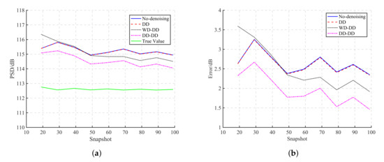 Figure 8 shows the variation of the RMSE of radiated noise measurement with the number of snapshots. The RMSEs of DD and no-denoising decrease with the increasing snapshots, but the downtrend becomes tiny when the number of snapshots exceeds 30, which is 2 times the number of hydrophones. Snapshot number is not the critical factor for DD to reduce spatially correlated noise, but the correlation of noise is. The improvements of WD-DD and DD-DD on radiated noise measurement arise when the snapshot number is greater than the number of hydrophones. The RMSEs of WD-DD and DD-DD decrease rapidly with the increasing number of snapshots. Moreover, the RMSE with DD-DD is smaller than the other two denoising methods.