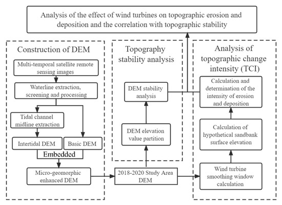 The DEM of the wind farm is the basis for the hypothetical sandbank surface discrimination method (HSSDM) in the absence of wind turbines. We improved the remote sensing waterline method to obtain a more refined tidal topography (Section 4), making full use of the DEM for topography stability analysis (Section 5) and using the HSSDM (Section 6) to analyse and assess the intertidal zone erosion, deposition status and intensity caused by the construction of wind turbines for long-term sustainable assessment; the technical flow chart is shown in Figure 2.